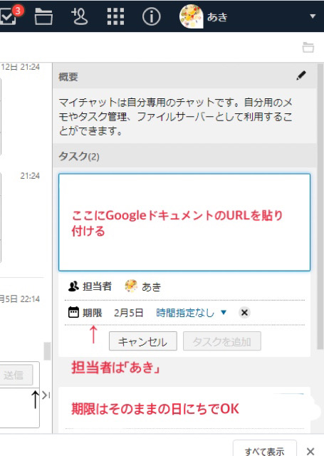 ③担当者は「あき」に。期限は入力したその日のままでOK。時間は指定しなくてOKです。